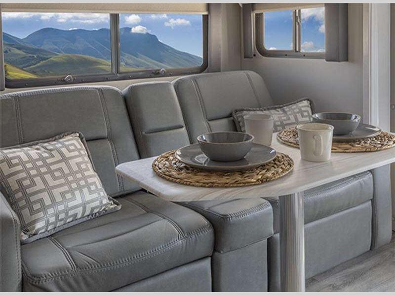 Additional Features: Roller shades and valances, Soft touch padded walls and ceiling, Premium vinyl flooring throughout, Booth dinette w/convertible bed, Ultra leather furniture, Maple hardwood cabinetry.