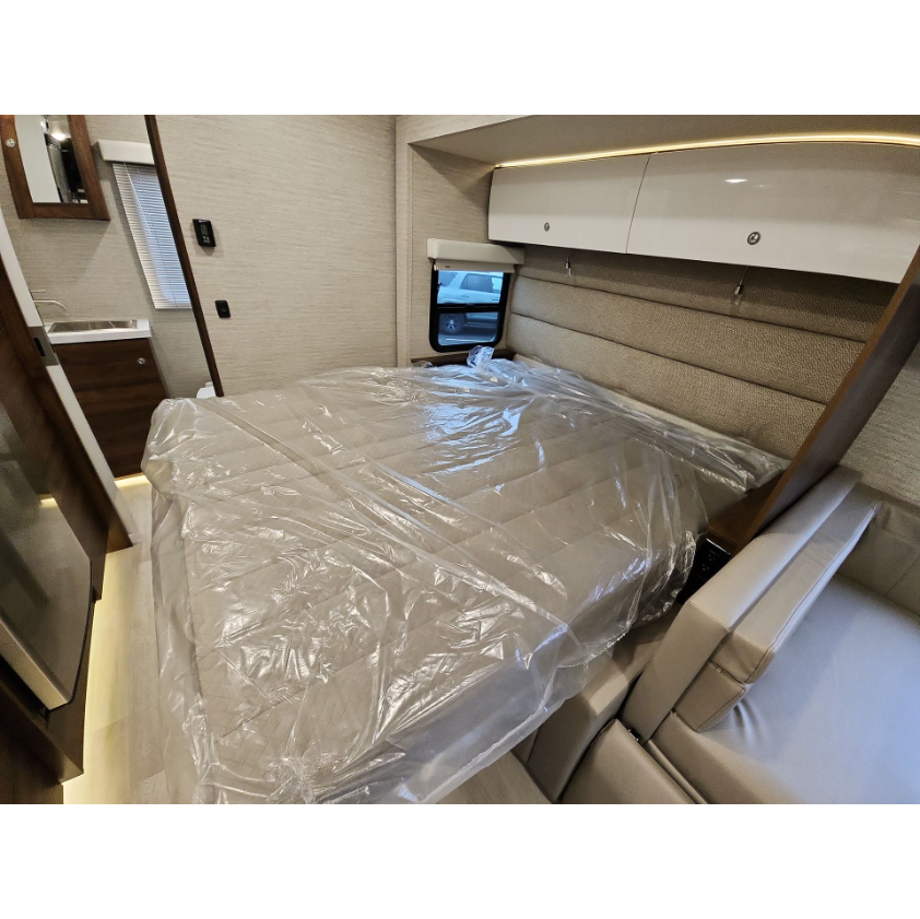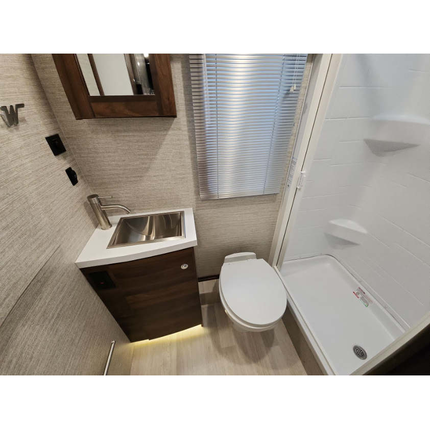 The bathroom in this motorhome is spacious enough that you’ll feel like you have a personal spa on board. There’s a walk-in shower with a self-cleaning shower screen and an upgraded showerhead to ensure you get a relaxing experience every time.
