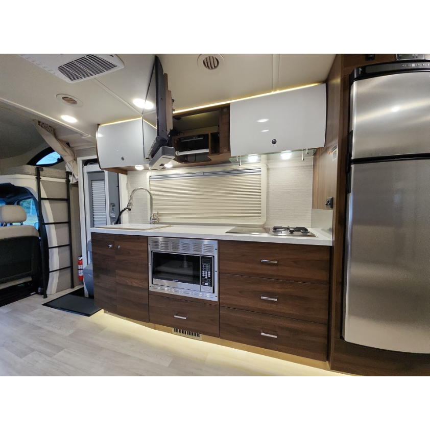 Make delicious meals to keep your crew ready for the trails ahead when you cook in this Winnebago Navion motorhome. There is a dual-burner stove and a stainless steel kitchen sink, along with plenty of counter space to make cooking easy. Additionally, there’s plenty of storage for all your ingredients and more.
