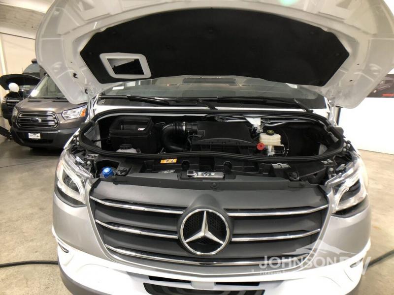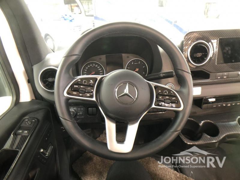Other cab conveniences include: 10.25″ MBUX Touchscreen Multimedia Infotainment Center with Navigation, WiFi hotspot, Intelligent Voice Control and Rear Color Camera Leather-wrapped steering wheel Power door locks w/remote Power windows Power mirrors w/defrost and turn signals Adaptive cruise control Rain sensing wipers 12V/USB powerpoints